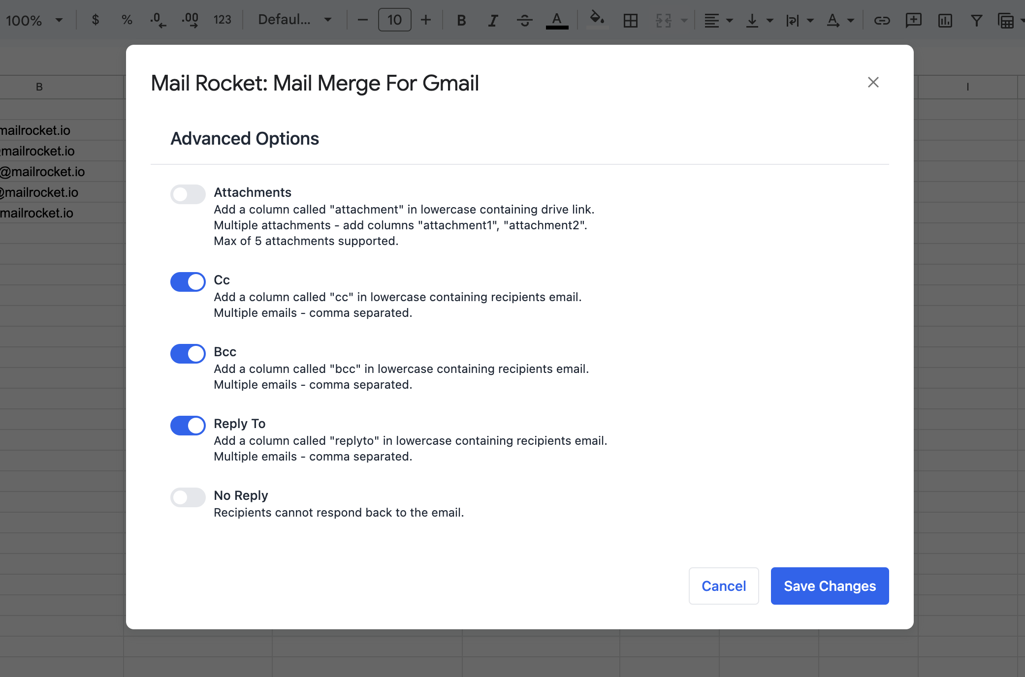 * Within your spreadsheet, insert a new **column labeled "replyto"** to specify  Reply-To Address.