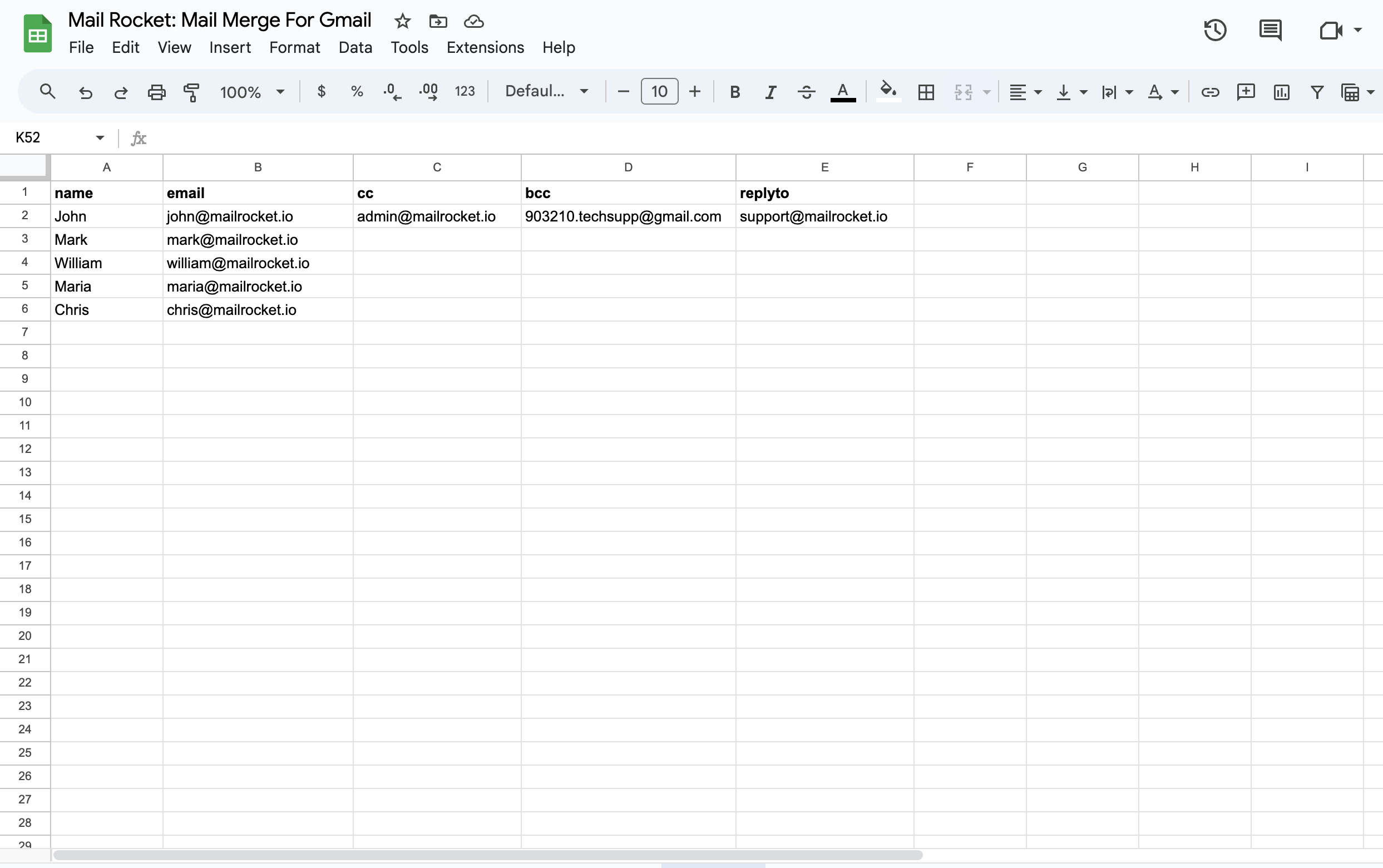 * Within your spreadsheet, insert a new **column labeled "bcc"** to specify Bcc recipients.
