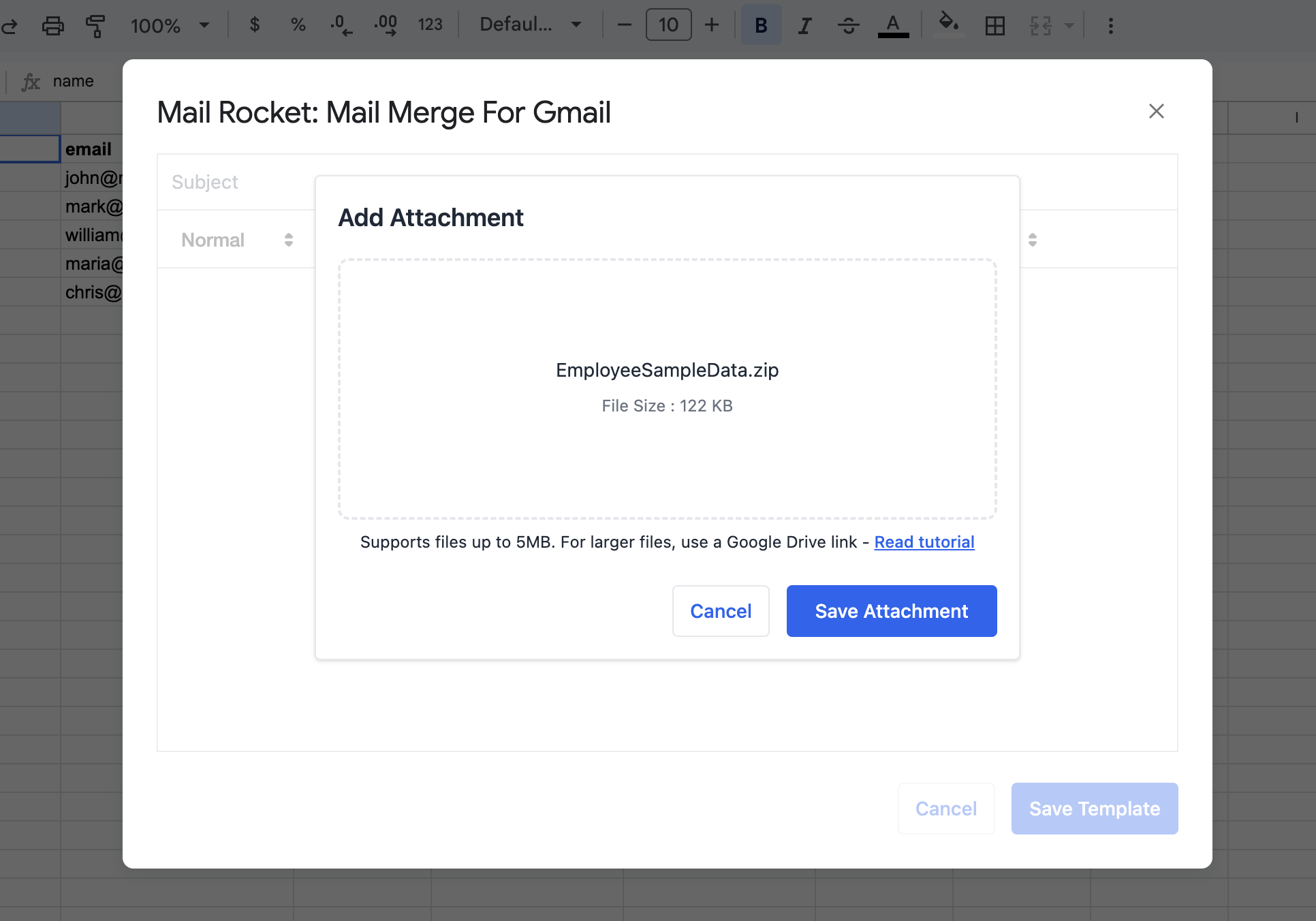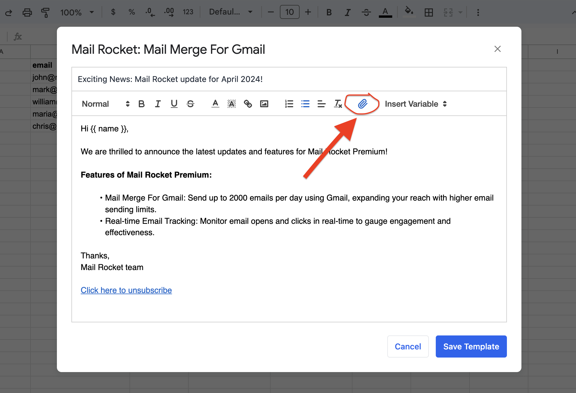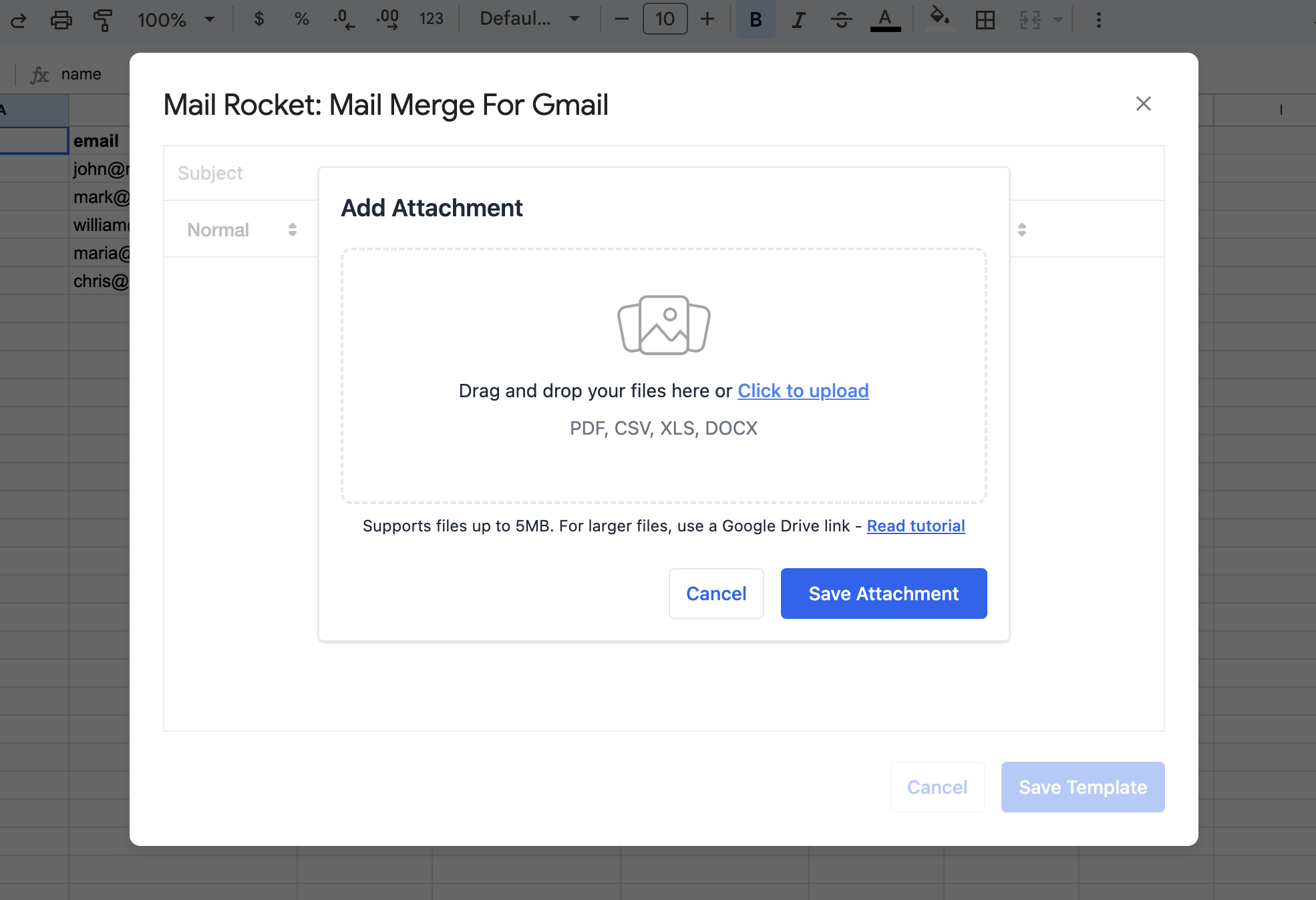 Mail Rocket allows you to include attachments in your Gmail mail merges by uploading multiple files directly into your email template.