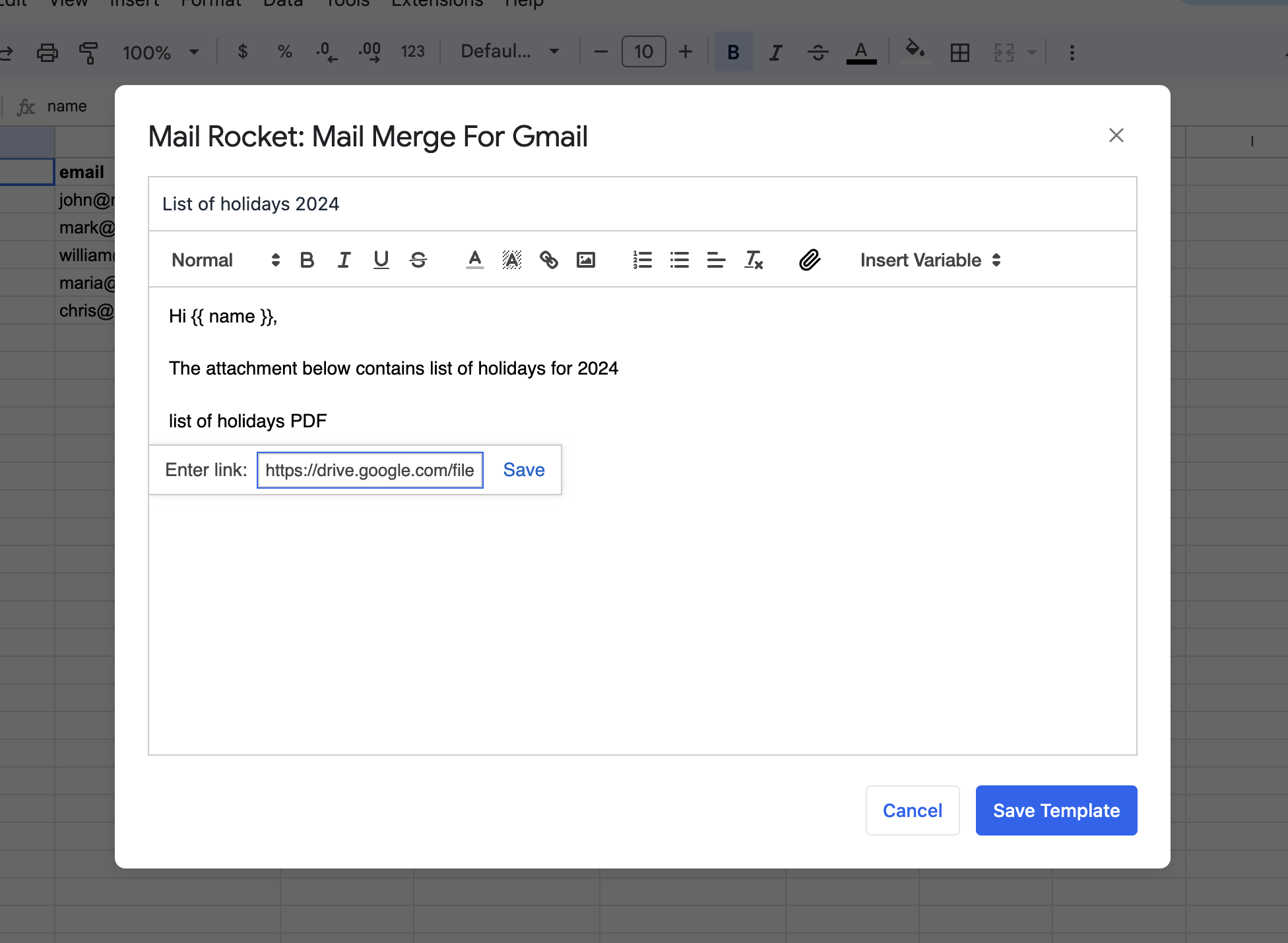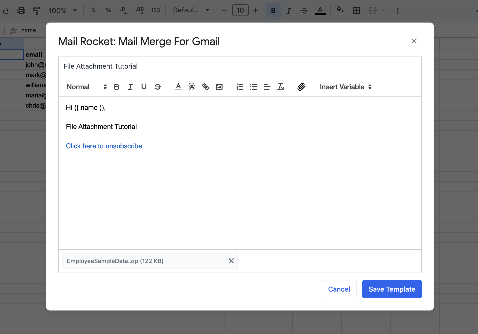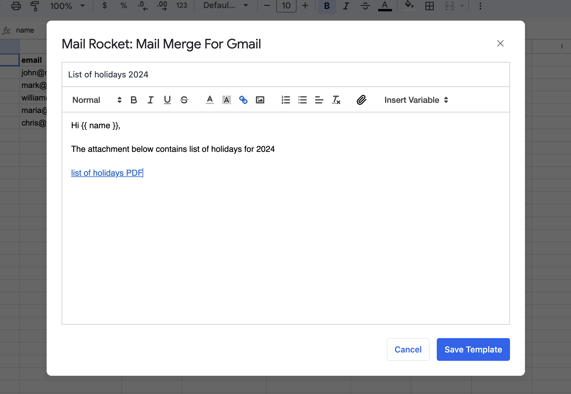 Mail Rocket allows you to include attachments in your Gmail mail merges by uploading multiple files directly into your email template.