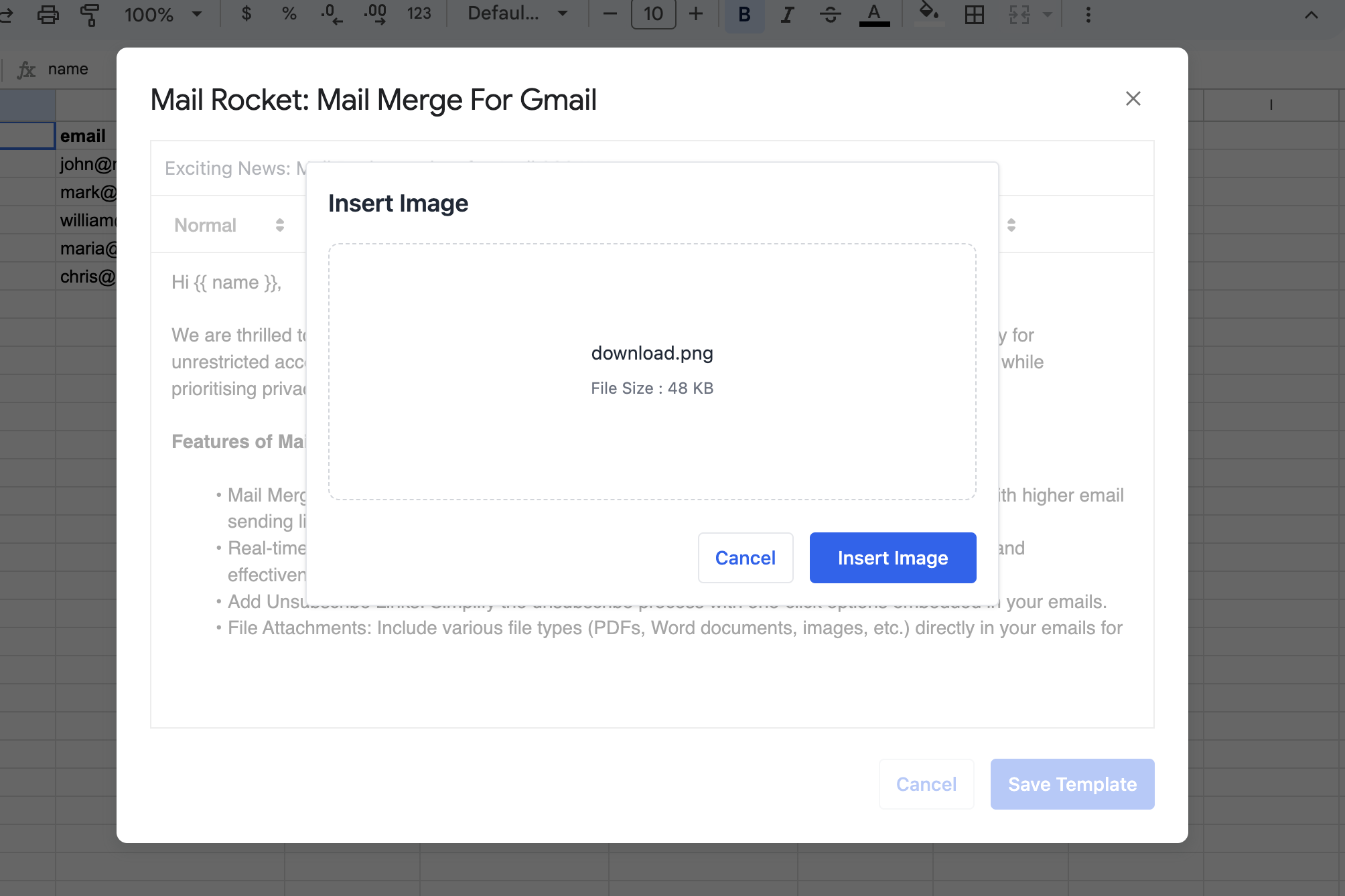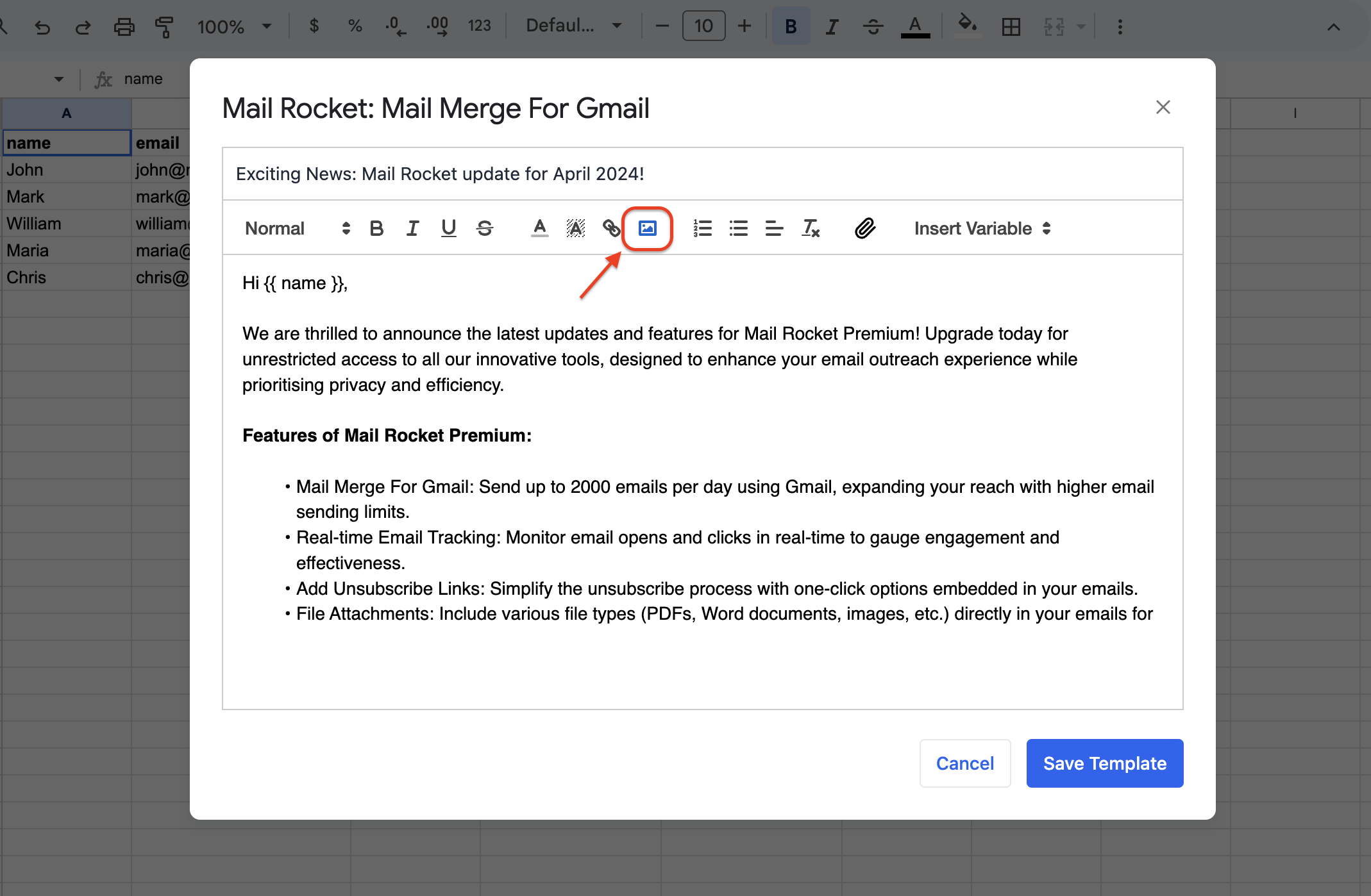 Mail Rocket allows you to insert images directly into the email editor. You can also copy and paste images directly into the editor.