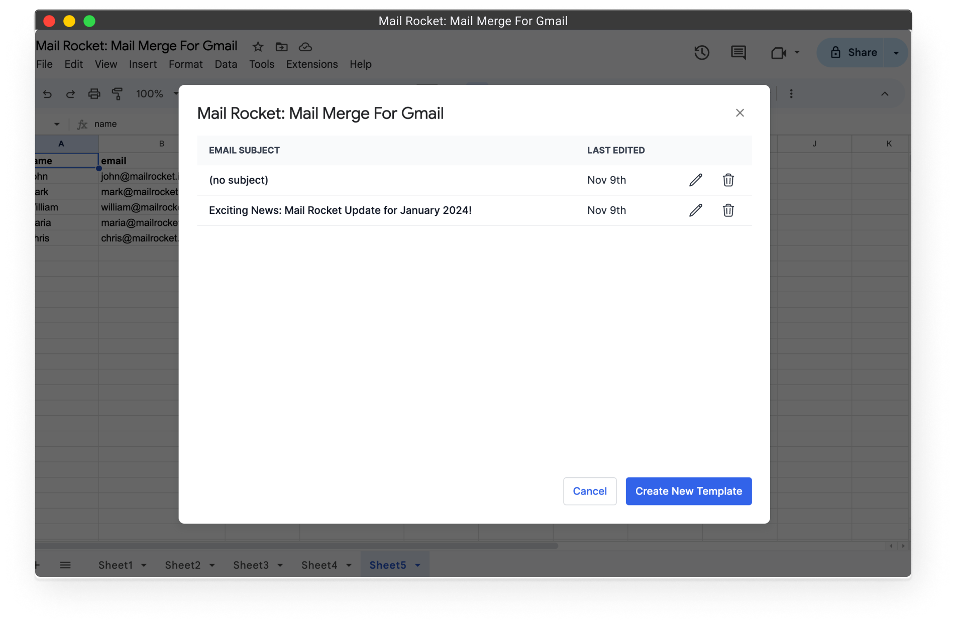 Mail Rocket provides the ability to edit existing templates and delete unwanted templates.