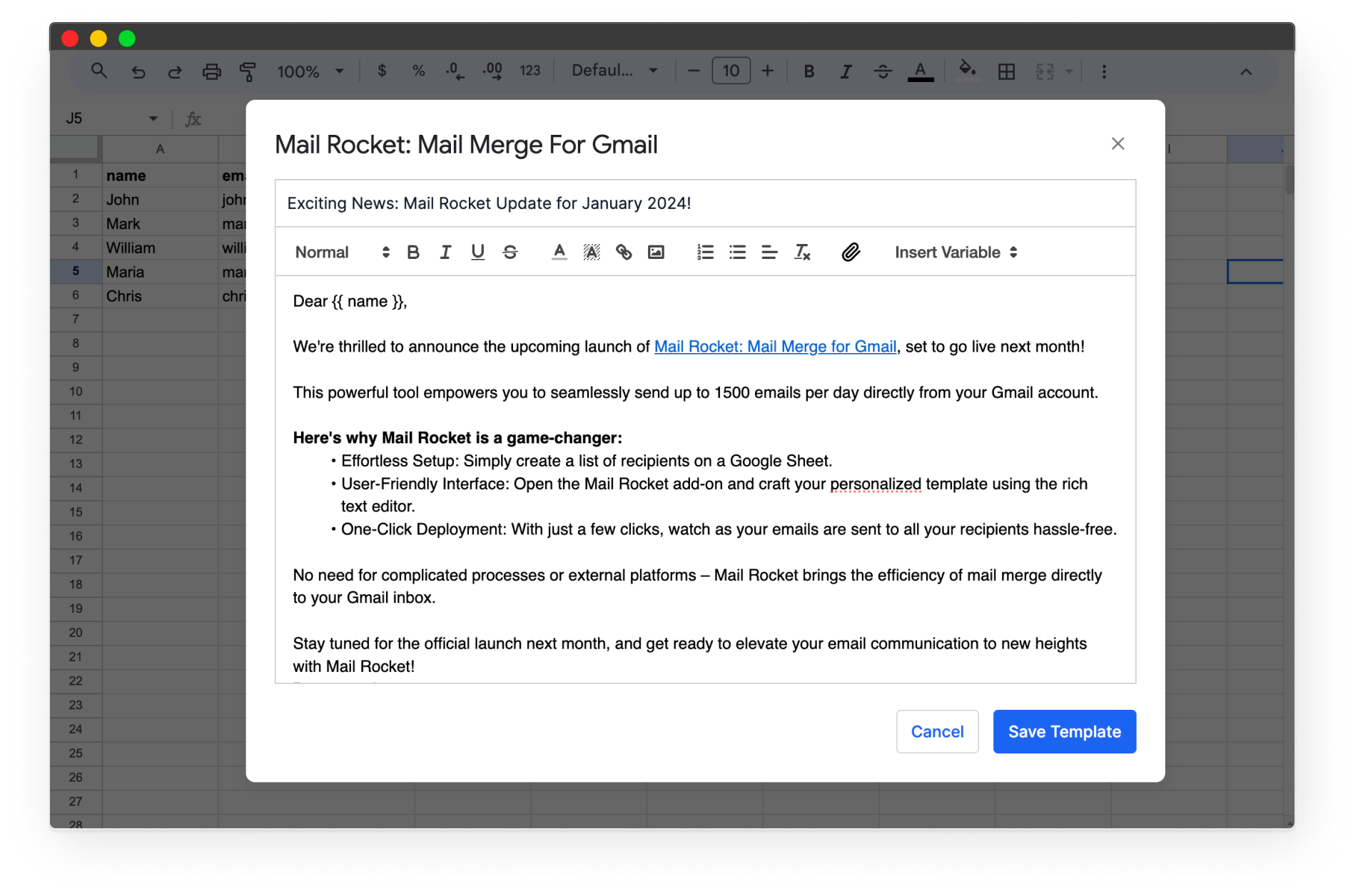 * Use merge tags (e.g., {{ firstname }}) in your email content to dynamically populate personalized data from your spreadsheet.
