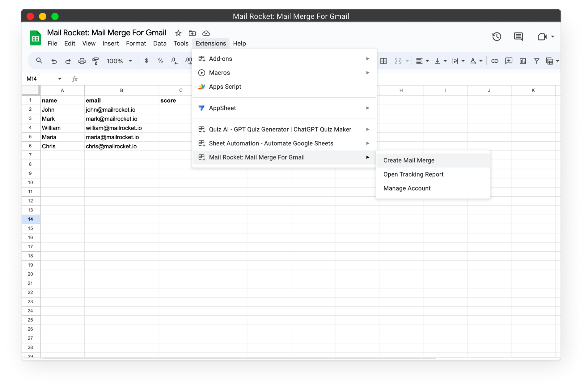 To create a new email template, start a new mail merge campaign by going to **extensions -> Mail Rocket: Mail Merge For Gmail -> Create a new Mail Merge Campaign** in your Google Sheet.
